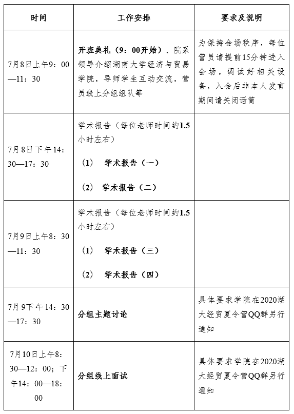 为方便联系,学院建QQ群,群名:2020湖大经贸夏令营群,群号:875895559,请申请通过且确认参加活动的同学以“姓名+来源高校+报考专业”命名申请加群。