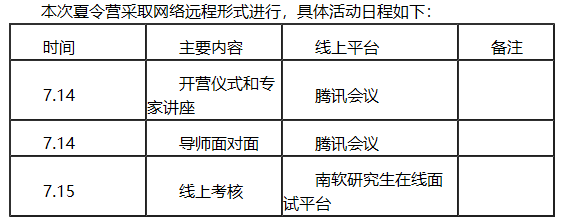 本次夏令营采取网络远程形式进行,指定南软研究生招生在线面试平台和腾讯会议,活动具体日程安排将与获得夏令营入营资格学员名单同步公布。